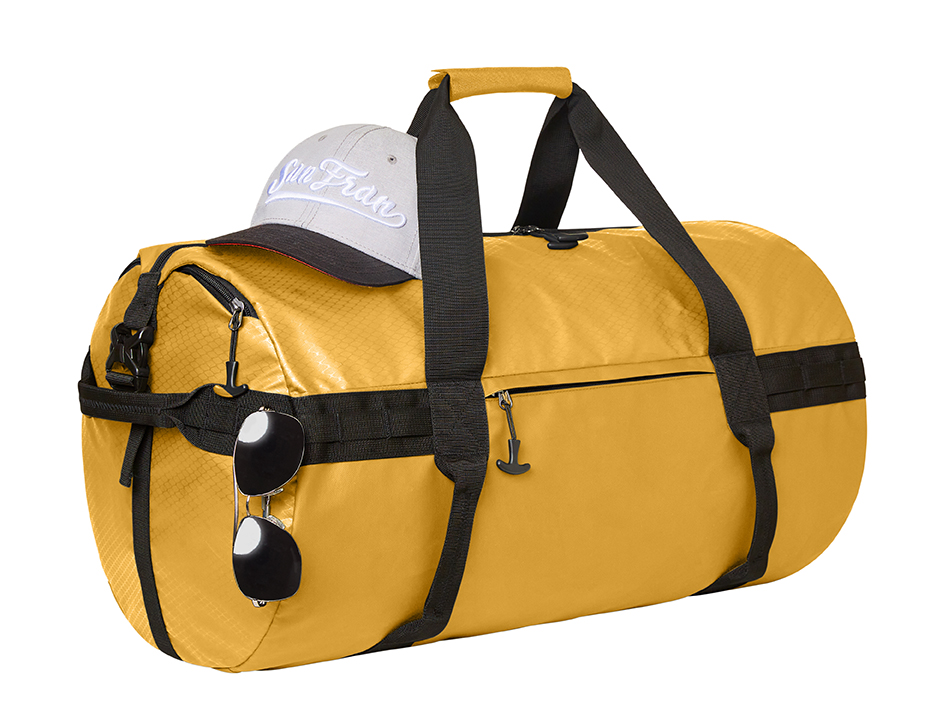 komfortable Sport-Reisetasche mit Rucksackfunktion; geräumiges Hauptfach mit 2-Wege-Reißverschluss und seitlichen Steckverschlüssen; seitliches Reißverschlussfach; Reißverschluss-Vortasche; umlaufendem Funktions- Schlaufenband; diverse Handgriffe; Tragegriffe und versteckte, gepolsterte und längenverstellbare Schultergurte