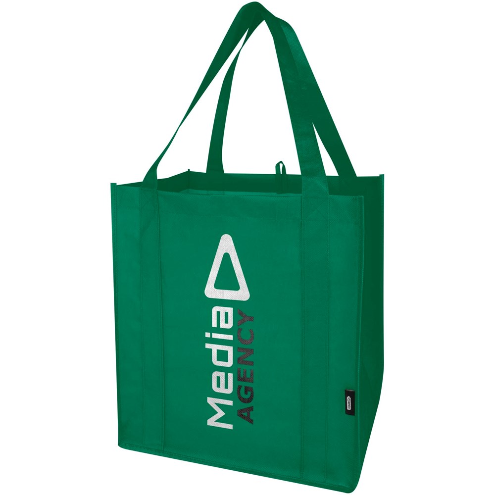Die Liberty Tragetasche aus GRS-zertifiziertem Recyclingmaterial besteht aus strapazierfähigem und reißfestem RPET-Non Woven und verfügt über einen harten Boden, der sie vielseitig und stabil macht. Die Tasche hat ein großes Hauptfach und 25 cm lange Tragegriffe. Fassungsvermögen: 29 Liter. Beständigkeit bis zu 12 kg.