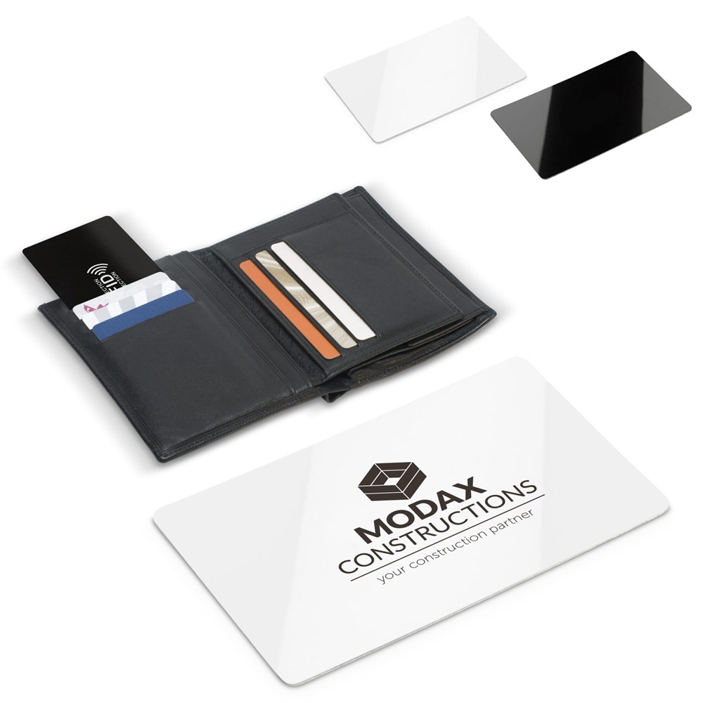 RFID Karte im Kreditkartenformat. Legen Sie diese Karte in Ihre Geldbörse und verhindern Sie Betrug durch illegale Nutzung von RFID-Scannern und -Lesern mit Ihren Bankkarten. Diese Karte stört die Frequenz von Kartenlesern. Auf diese Weise beugt die RFID Karte der Kommunikation zwischen Chip und Bankkarte vor. Druck auf der weißen Seite.