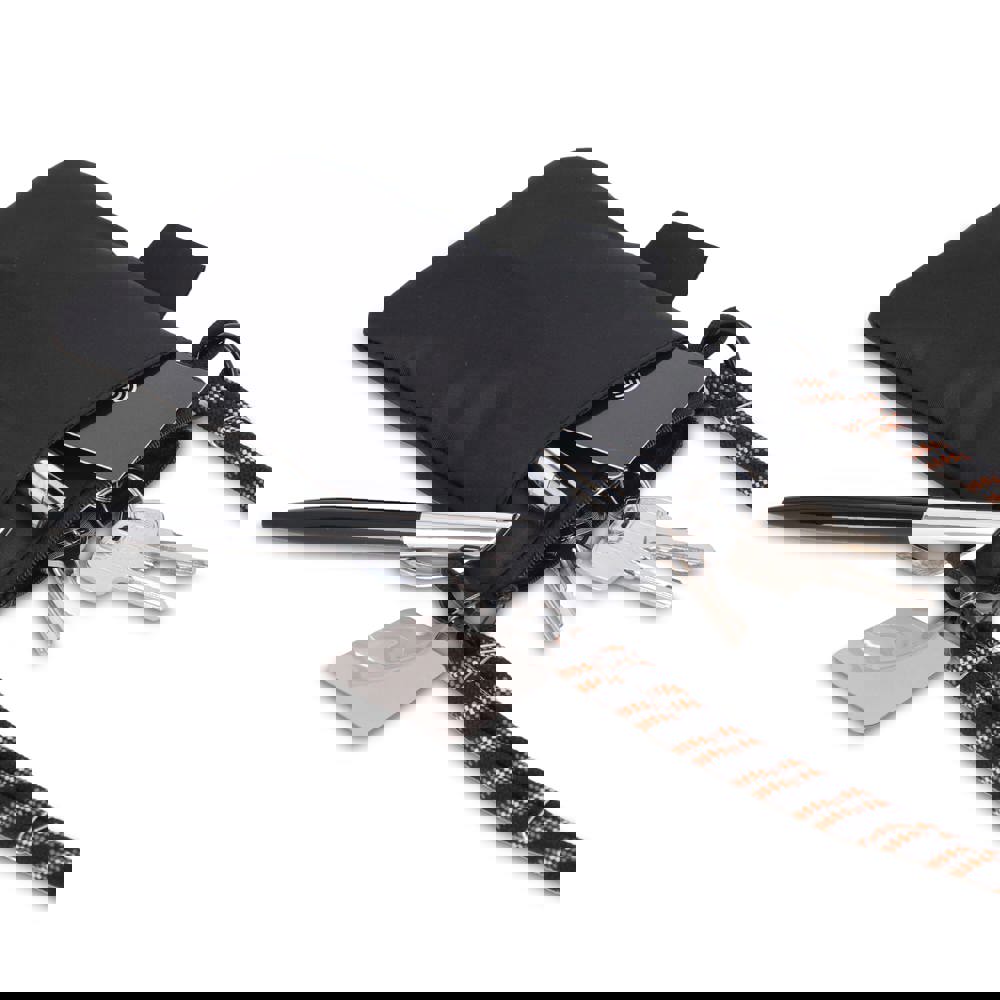 Diese kompakte Crossbody Tasche ist ideal fürs Telefon, Schlüssel und Brieftasche. Eine Schlaufe hält sicher einen Stift, während das Paracord-Band einen einzigartigen Touch verleiht. Das Design kann mit der mitgelieferten Lasche in ein Handykette umgewandelt werden, um die Hände frei zu haben.