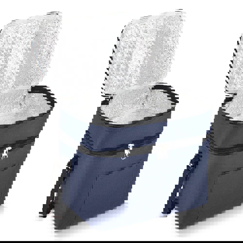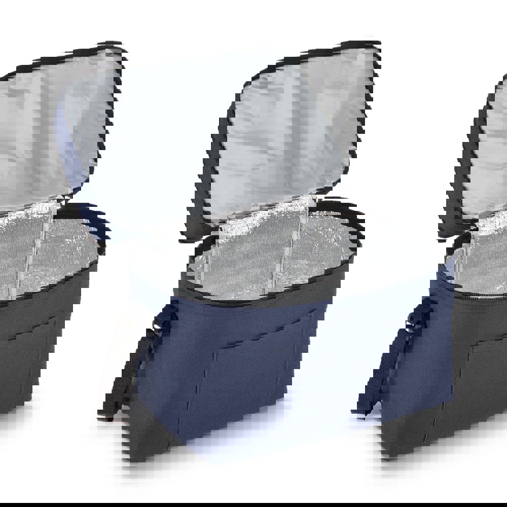 12-Liter-Kühltasche aus haltbarem, recyceltem PET 600D. Mit zwei Fächern für die Organisation von Lebensmitteln. Mit Alufolienfutter und einer Vordertasche. Praktisch und geräumig.