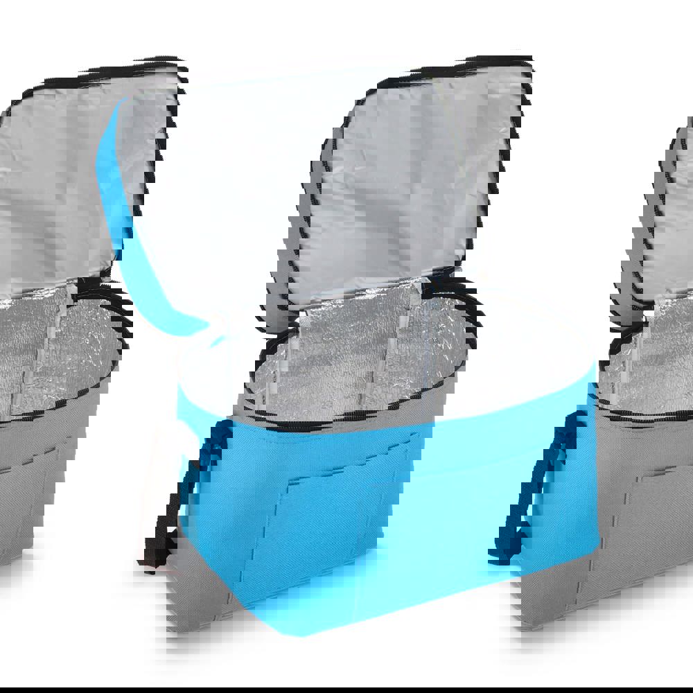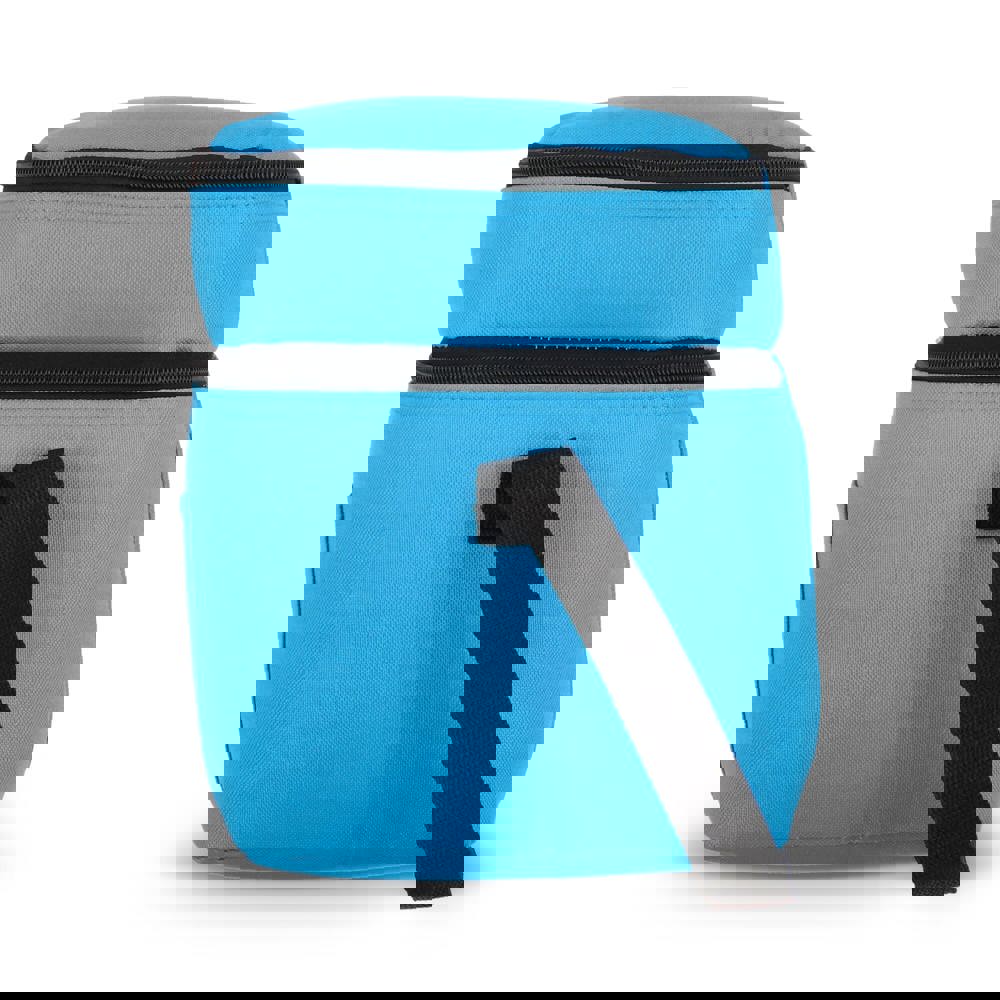 12-Liter-Kühltasche aus haltbarem, recyceltem PET 600D. Mit zwei Fächern für die Organisation von Lebensmitteln. Mit Alufolienfutter und einer Vordertasche. Praktisch und geräumig.