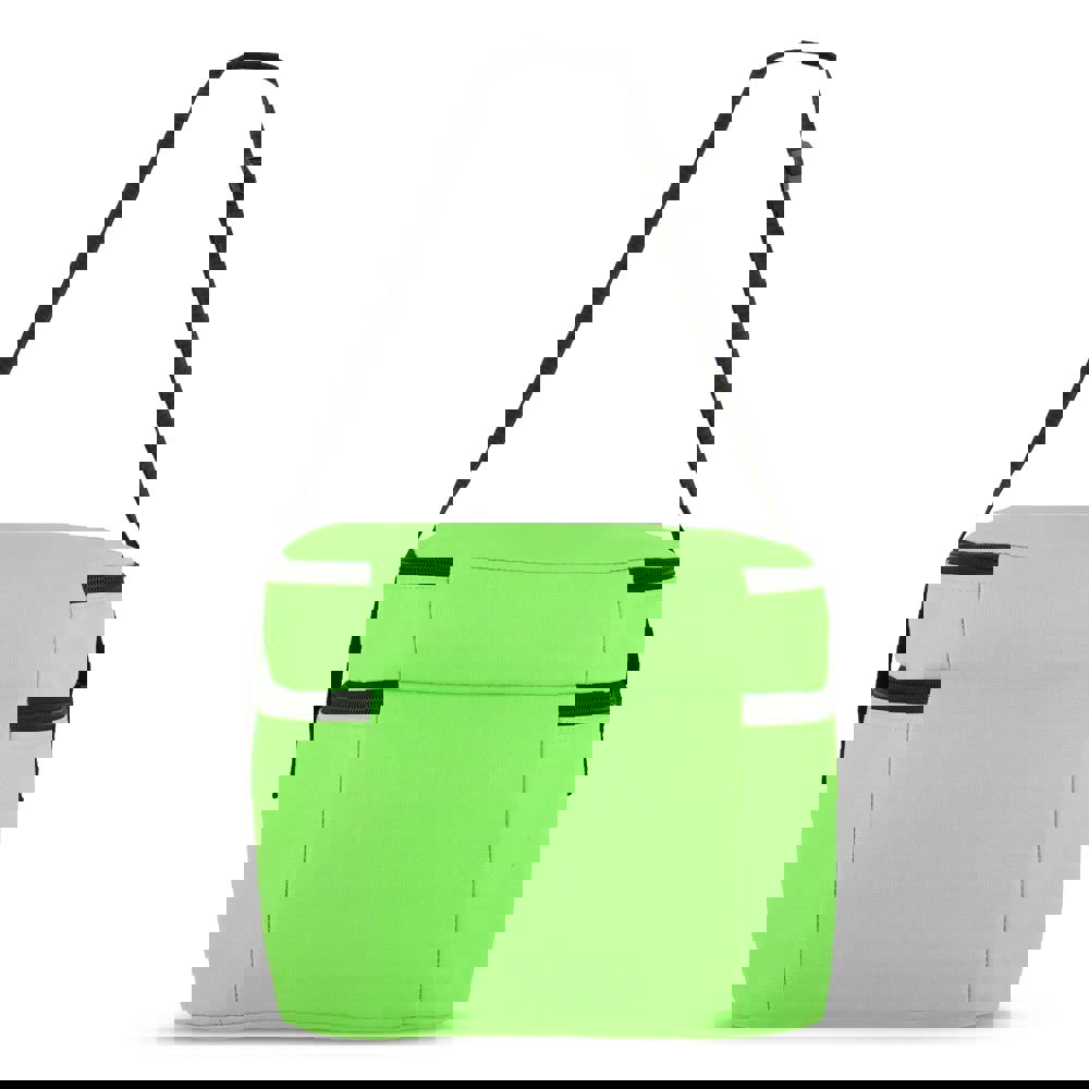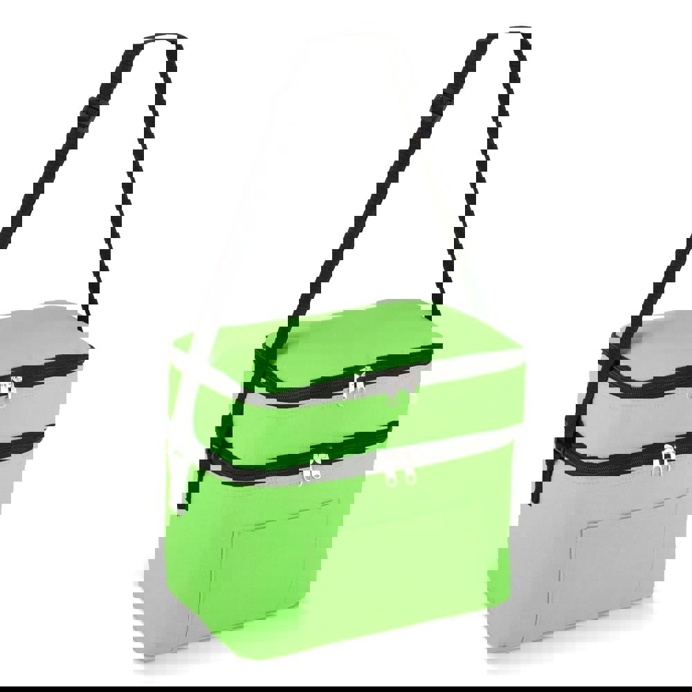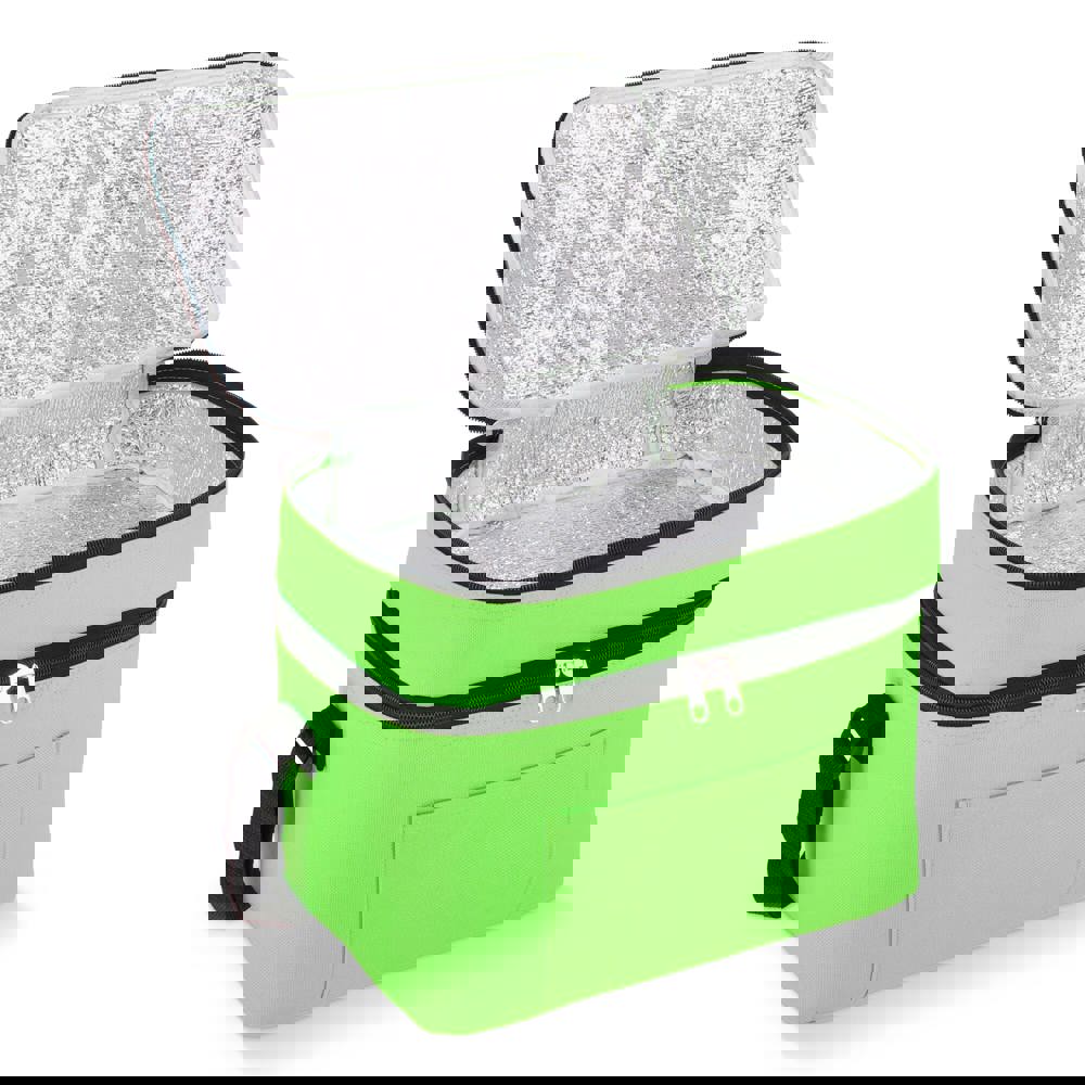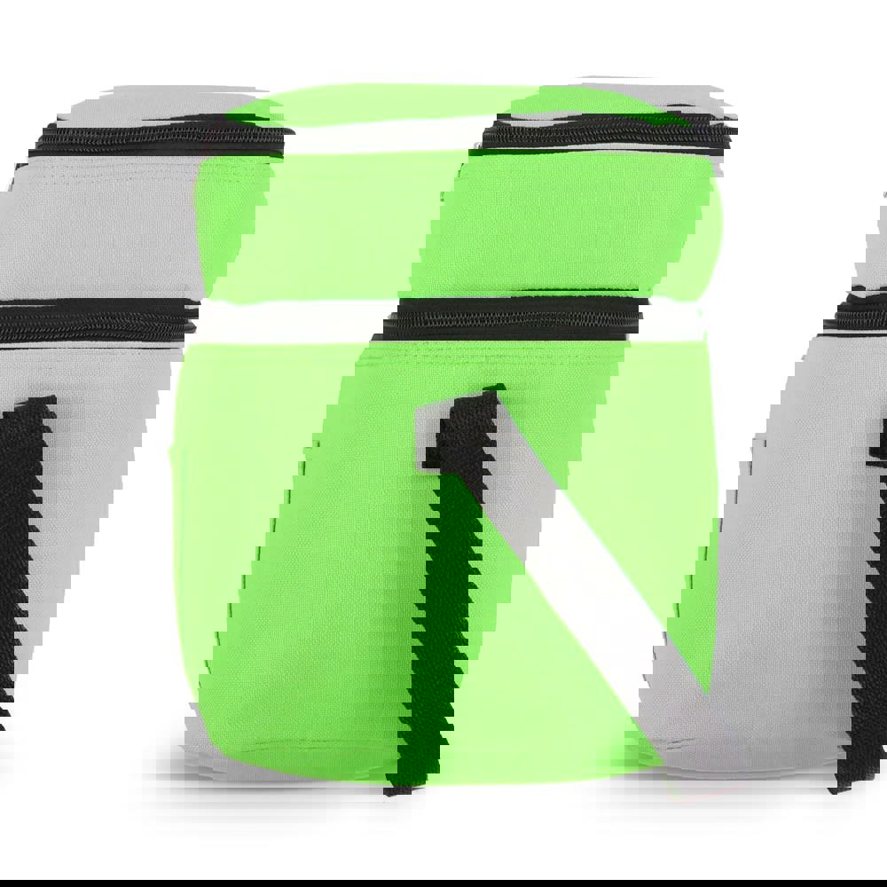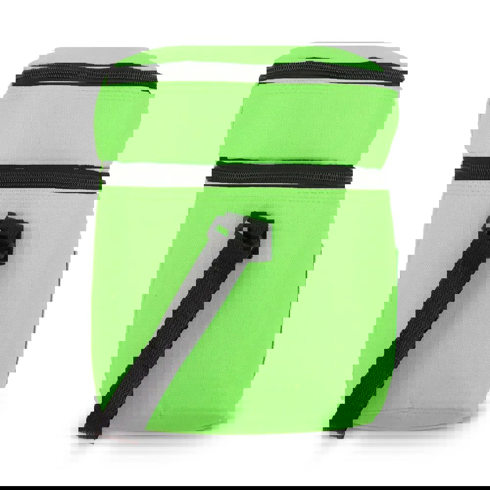 12-Liter-Kühltasche aus haltbarem, recyceltem PET 600D. Mit zwei Fächern für die Organisation von Lebensmitteln. Mit Alufolienfutter und einer Vordertasche. Praktisch und geräumig.