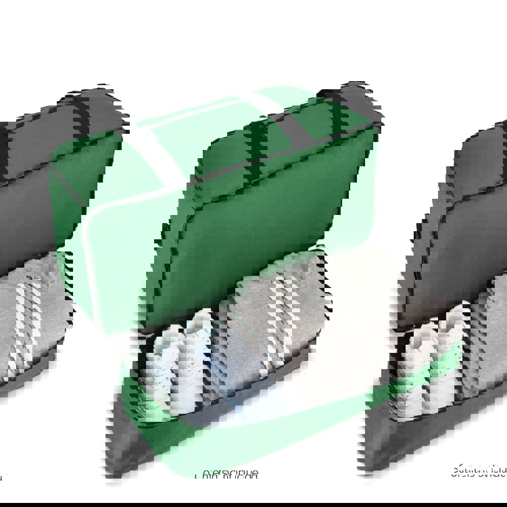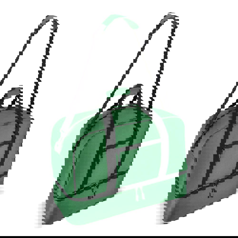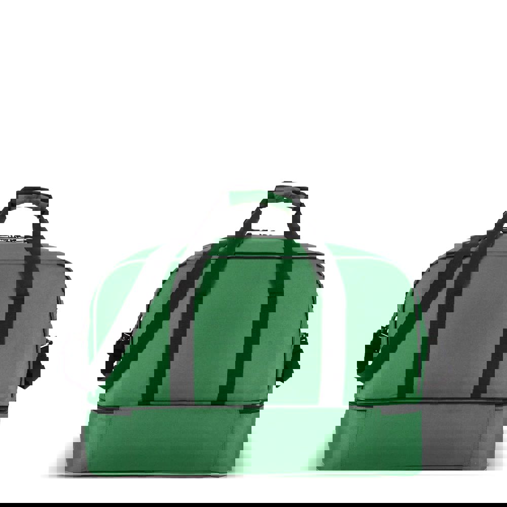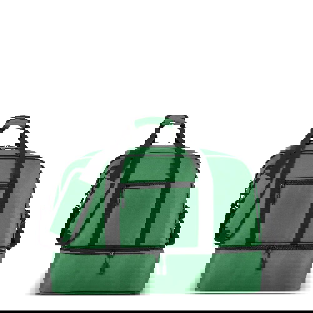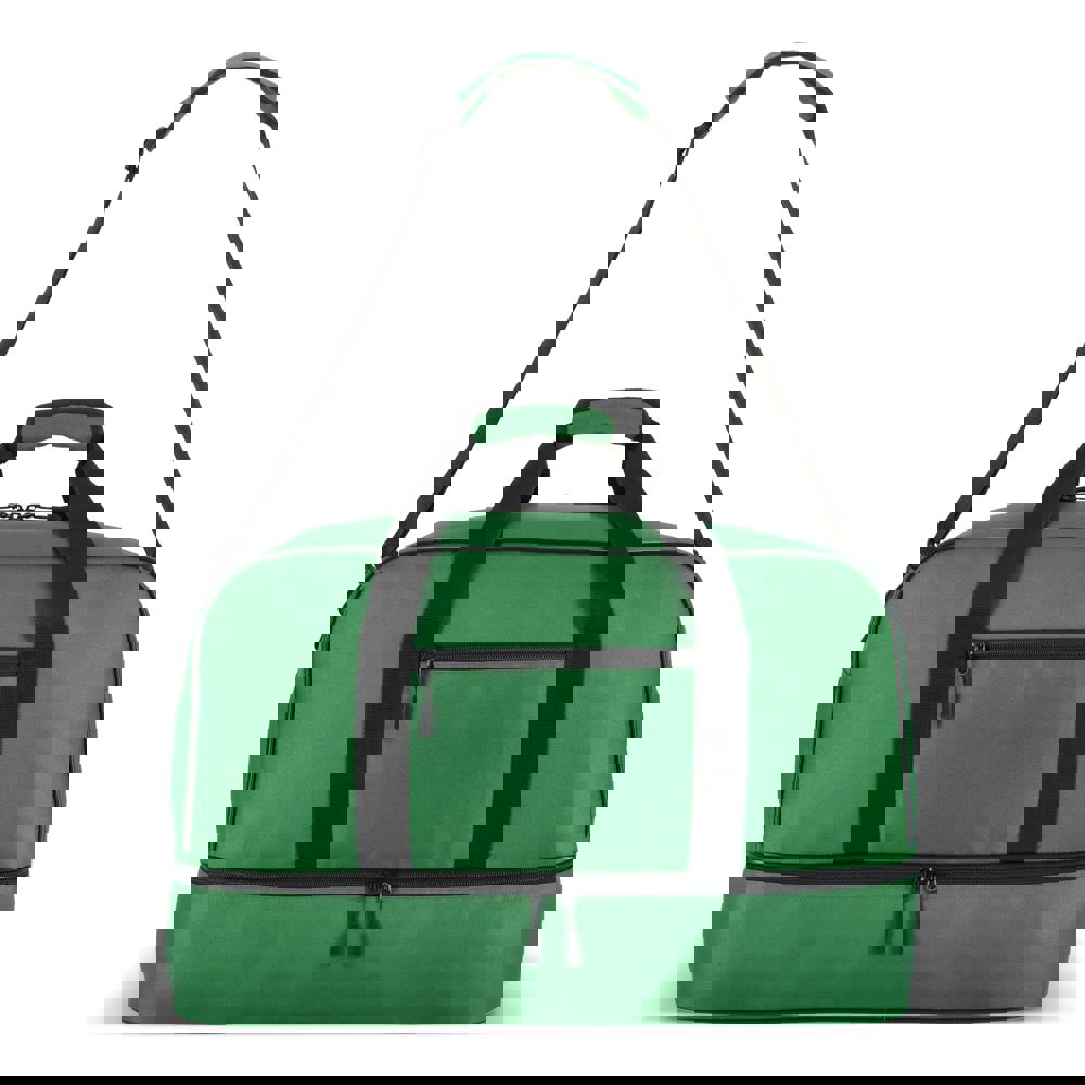 Reise- oder Sporttasche mit zwei Fächern aus recyceltem 600D-Polyester. Mit Griffen, abnehmbarer Schultergurt, Frontfach mit Reißverschluss und stabiler Bodenplatte. Die zwei Fächer trennen nasse/verschmutzte Kleidung oder Handtücher nach dem Training bzw. Schuhe von der Kleidung auf Reisen.
