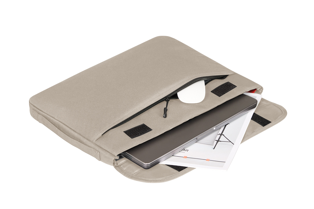 elegante Laptop-Mappe mit recyceltem Oberstoff; gepolstertes Hauptfach; gepolsterter Deckel mit Klettverschluss; große Vortasche mit Reißverschluss; innen AirTag-Fach; rückseitige Schlaufen zur Befestigung individueller Accessoires, z. B. Schultergurt (nicht im Lieferumfang); ergonomischer Handgriff rückseitig, zur Fixierung am Trolley-Gestänge geeignet; flacher seitlicher Handgriff zum einfachen Herausheben, z. B. aus Rucksäcken
