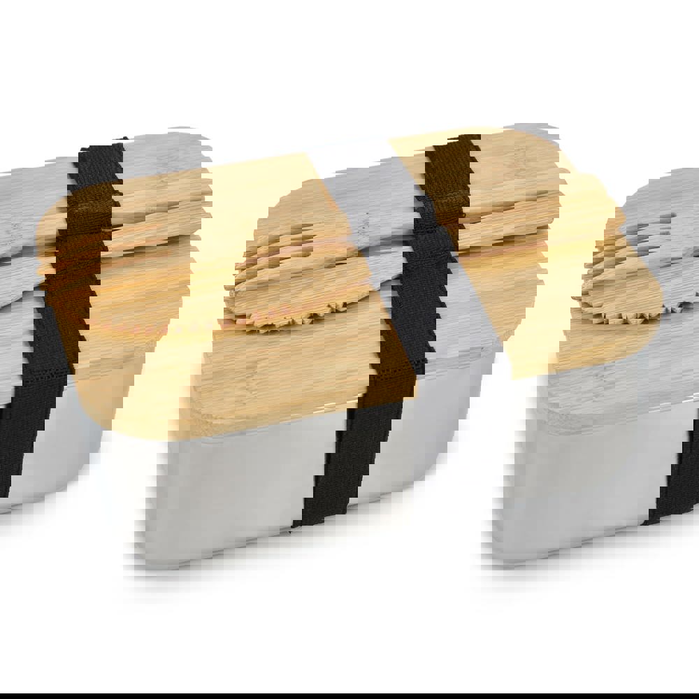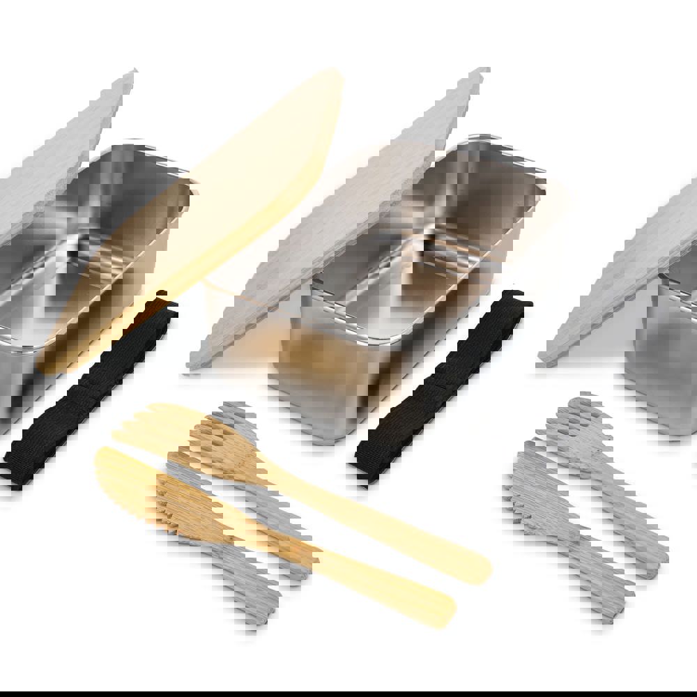 Edelstahl-Brotdose mit Bambusdeckel. Verschluss mit einem elastischen Band, an dem auch die Bambusgabel und das Bambusmesser aufbewahrt werden. Einzeln verpackt in einer Geschenkbox.