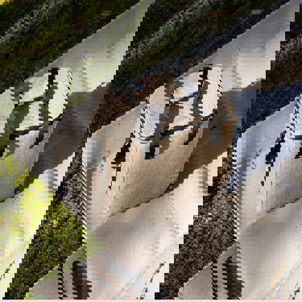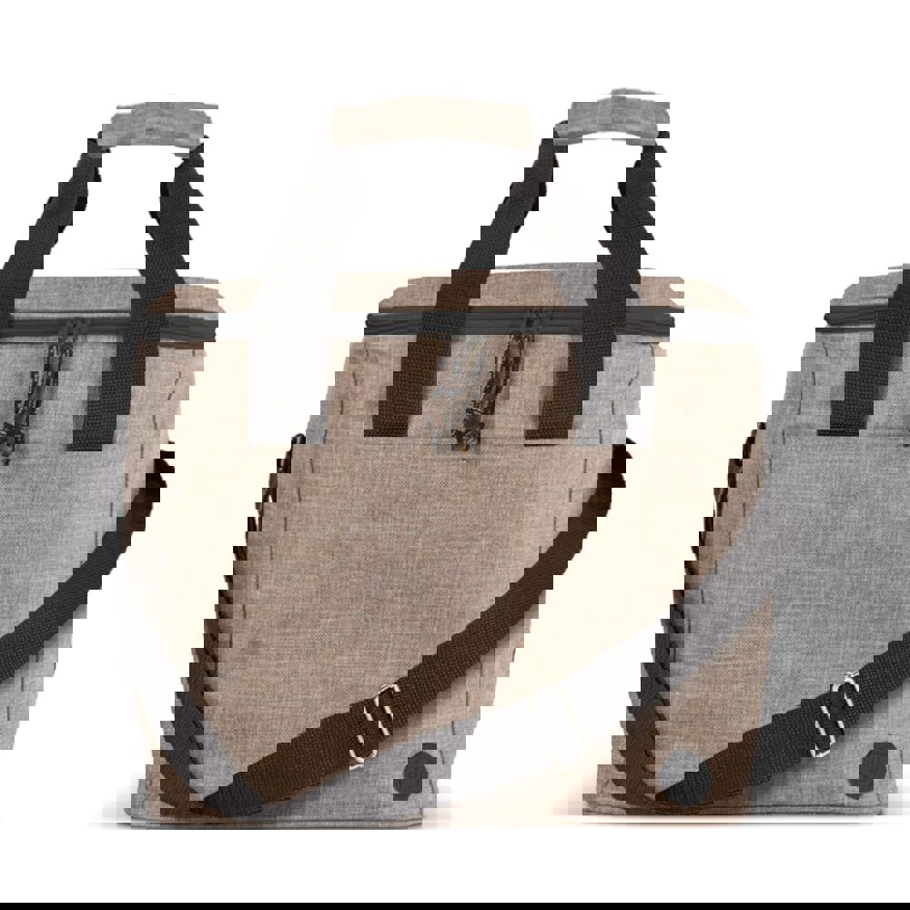Geräumige, stilvolle und sportliche Kühltasche aus grünem rPET-Material. Schöne Details in Beige und Schwarz. Praktisch mit einem Griff und einem verstellbaren Schultergurt.