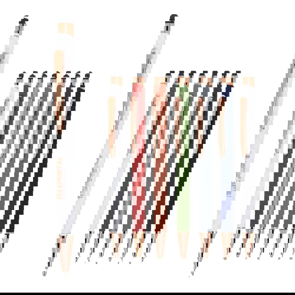 Stilvoller Kugelschreiber aus recyceltem Aluminium mit Metallclip. Die Farbe Rosa findet sich sowohl in den Akzenten des Kugelschreibers als auch in der Farbe der Lasergravur wieder. Der Kugelschreiber wird mit einer blauen Jumbo-Mine geliefert.