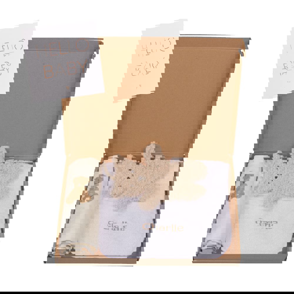 Geburtsgeschenkset S im Briefkasten-Karton inklusive personaliserte Karte, in Zusammenarbeit mit Jollein. Enthält ein weißes Lätzchen, ein Teddy Bear Schmusetuch und ein Teddy Bear Mulltuch Musselin. Verpackt in einer braunen Box mit Hello Baby-Etikett.
